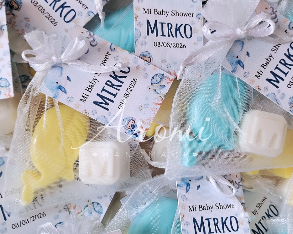 Recuerdo en jabón ideal para Baby Shower, Bautizo y Cumpleaños en modelo ballenas + letra. Presentación en bolsita de organza y tarjeta personalizada.