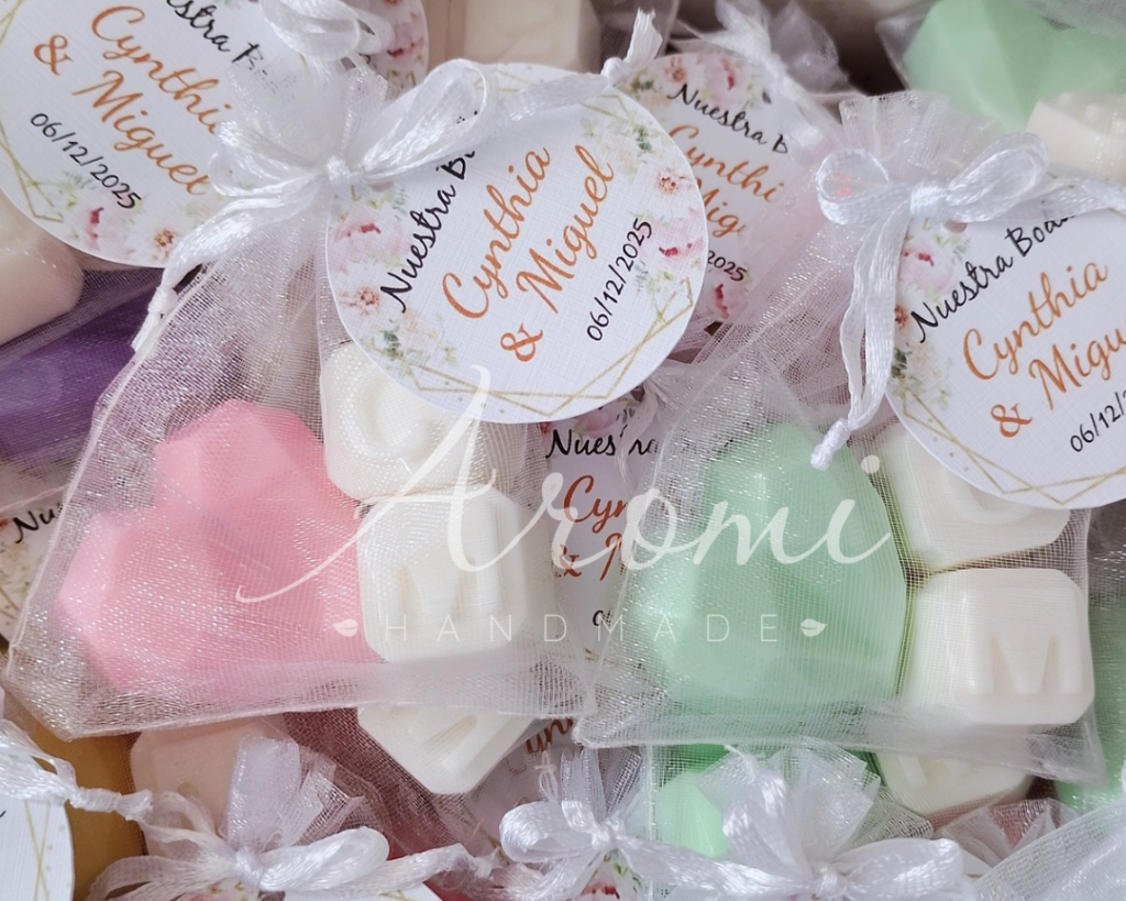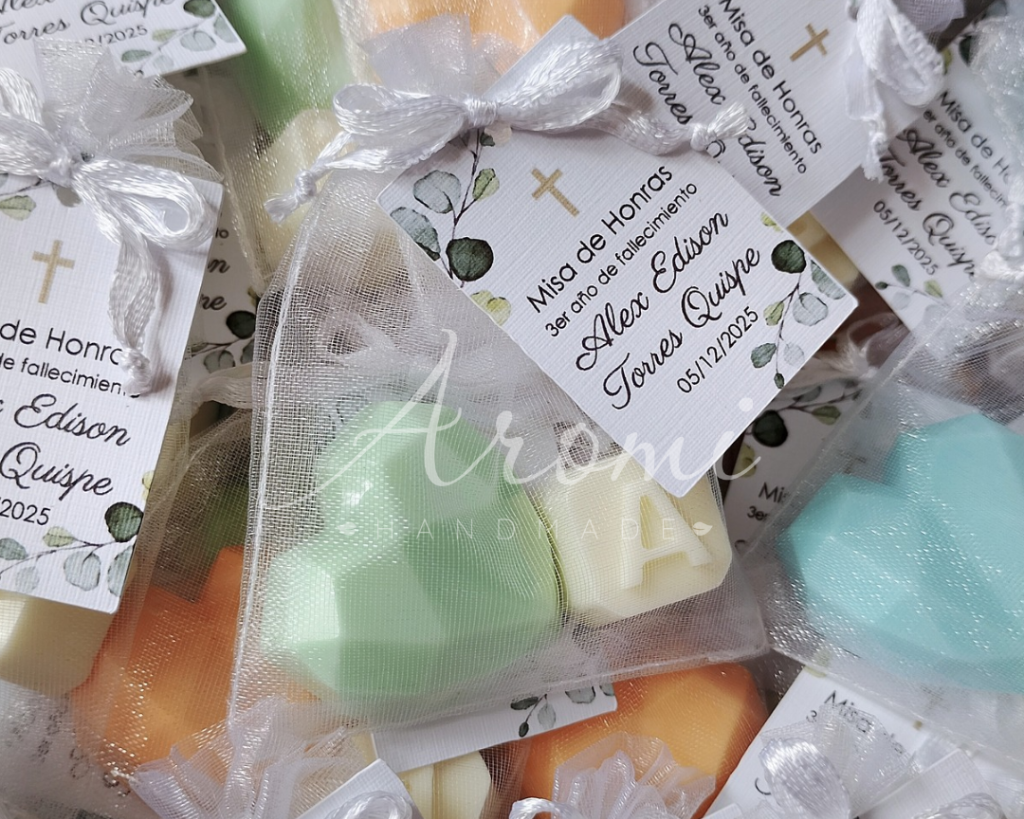 Recuerdo en jabón ideal para Misa de Honras en modelo mini corazón diamante. Presentación de bolsita de organza y tarjeta personalizada.