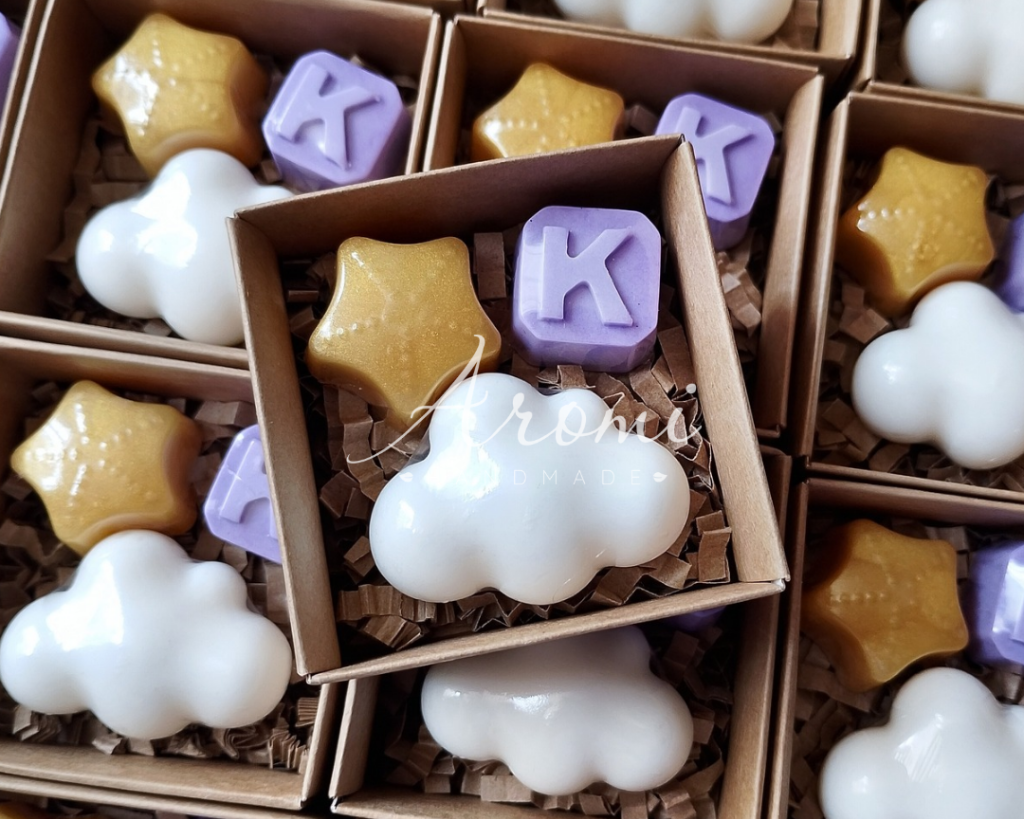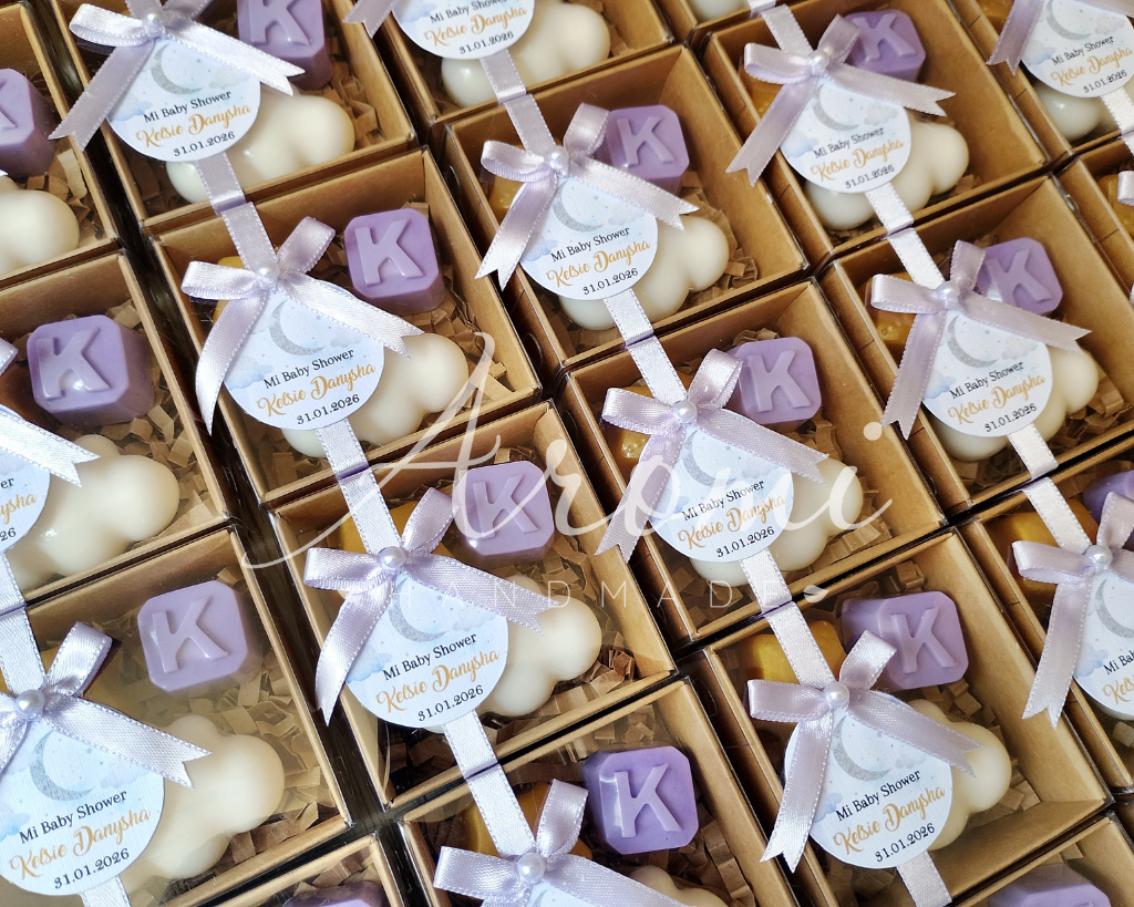 Recuerdo en jabón ideal para Baby Shower, Bautizo y Cumpleaños en modelo nube. Presentación en cajita con cinta y tarjeta personalizada.