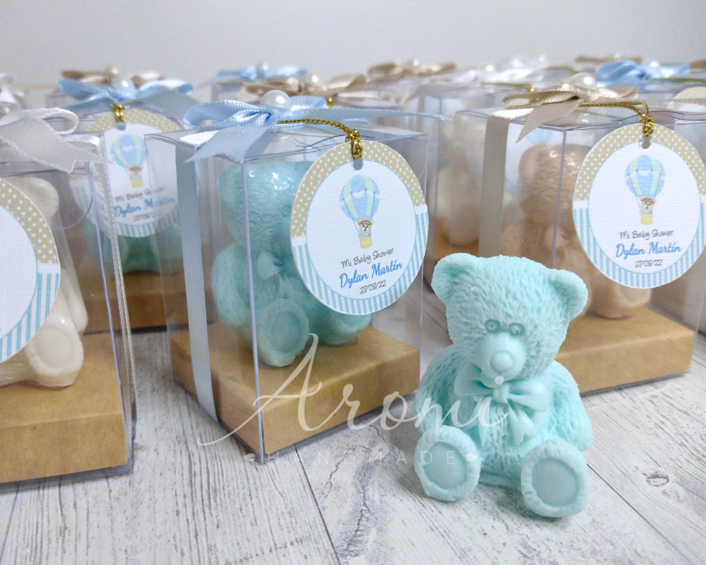 Recuerdo en jabón ideal para Baby Shower, Bautizo y Cumpleaños en modelo ositos 3D. Presentación en cajita con cinta y tarjeta personalizada.