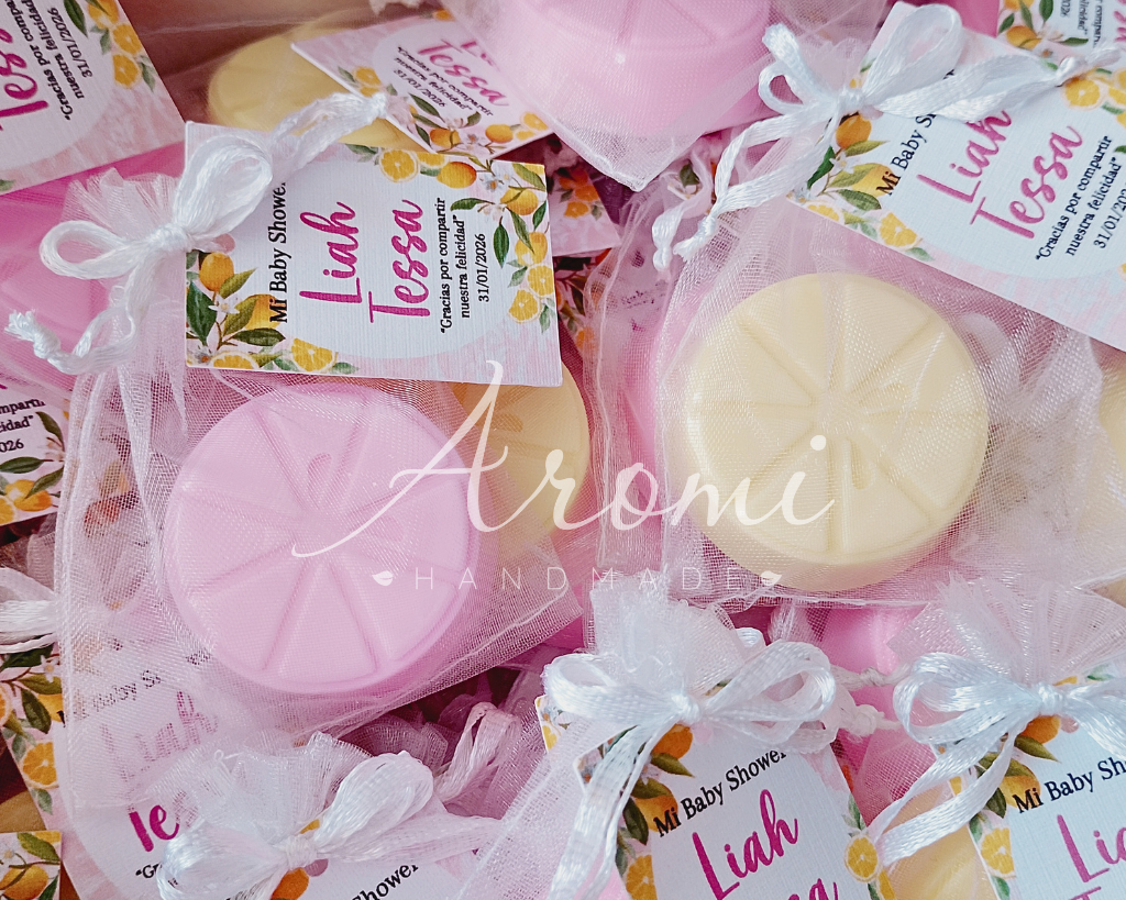 Recuerdo en jabón ideal para Baby Shower y Cumpleaños en modelo rodaja de limón. Presentación en bolsita de organza y tarjeta personalizada.