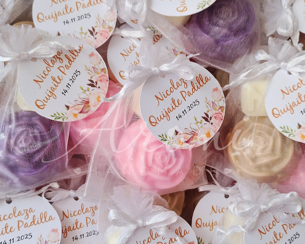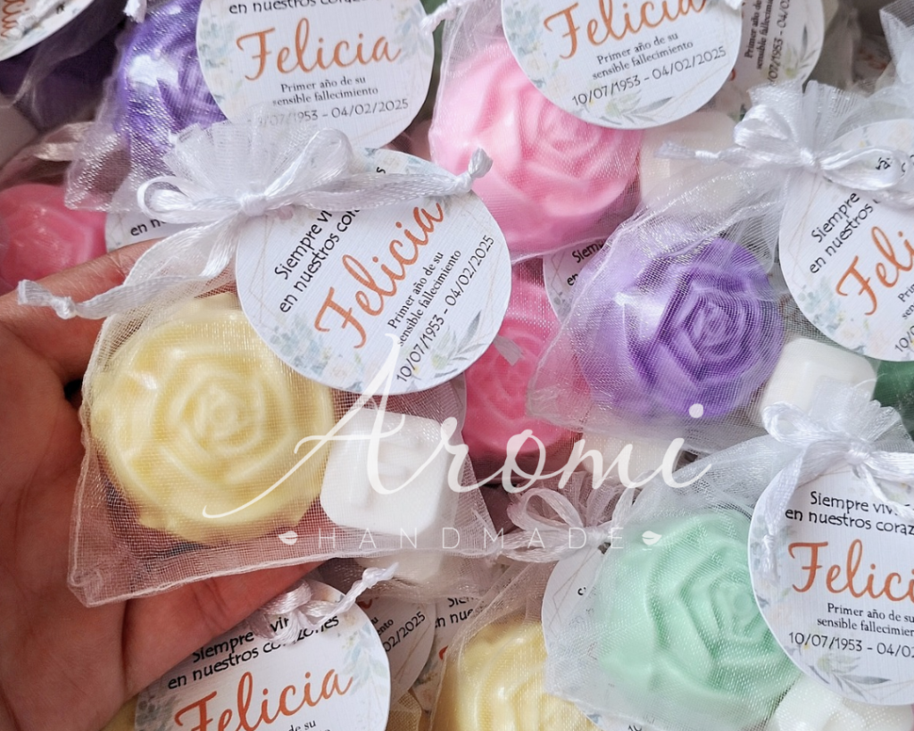 Recuerdo en jabón ideal para Baby Shower, Bautizo, Quinceaños, Matrimonios, Misa de Honras y Cumpleaños en modelo rositas. Presentación en bolsita de organza y tarjeta personalizada.